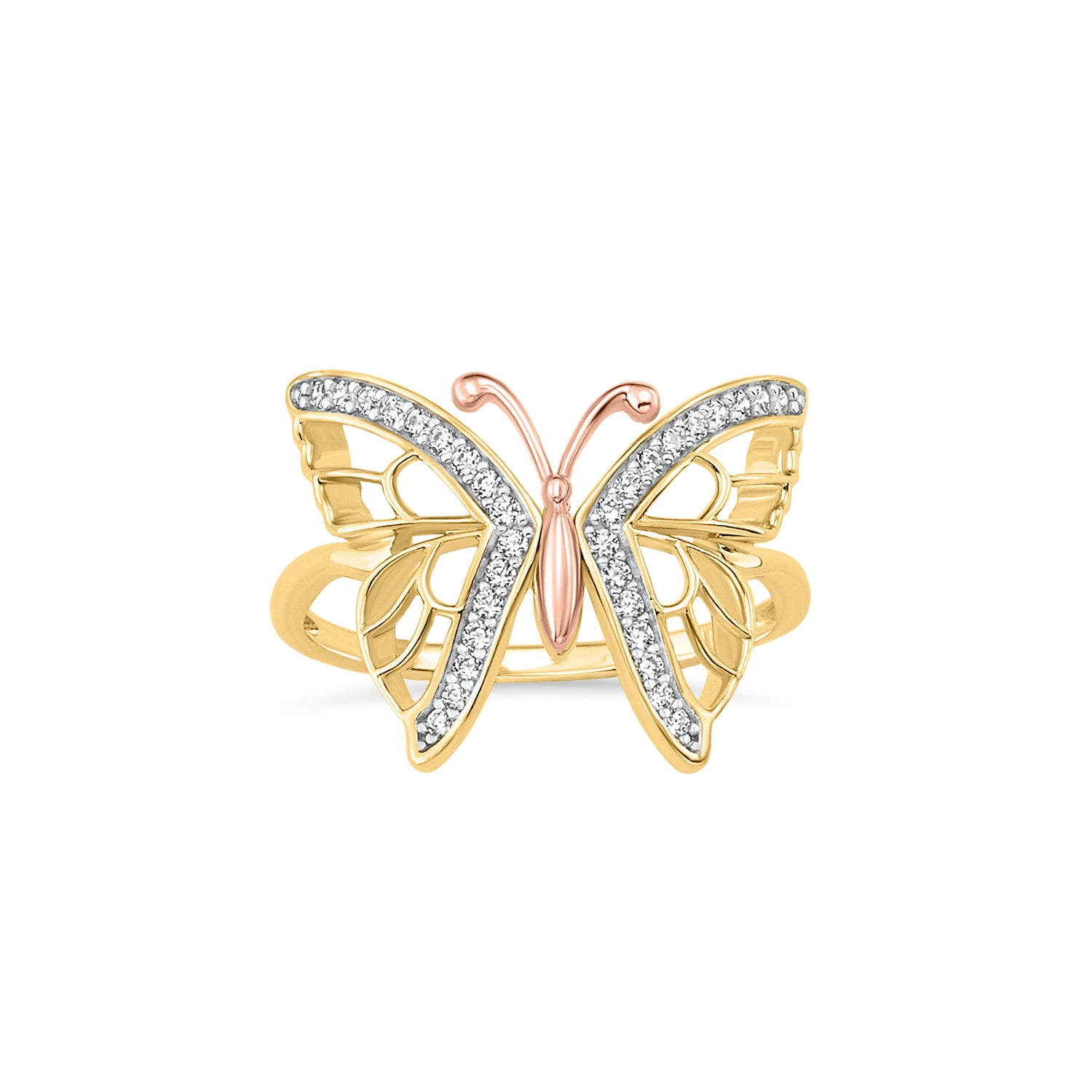 The ring band, crafted in warm 14k yellow gold, provides a solid and luxurious base for the butterfly. The butterfly's wings are crafted in exquisite rose gold, adding a delicate contrast and an extra dose of elegance to the design.